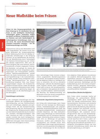 TECHNOLOGIEFR%u00c4SEN BOHREN DREHEN STECHEN INDUSTRIENNeue Ma%u00dfst%u00e4be beim Fr%u00e4senFr%u00e4sen ist eine Zerspanungsmethode, die ihren Ursprung im 18. Jahrhundert hat und heute zu den wichtigsten Bearbeitungstechnologien geh%u00f6rt. Inzwischen treiben der Bedarf an h%u00f6herer Produktivit%u00e4t, gr%u00f6%u00dferer Pr%u00e4zision und mehr Nachhaltigkeit die technologischen Entwicklungen beim Fr%u00e4sen voran. Die neuen Herausforderungen erfordern innovative L%u00f6sungen %u2013 wie die Pr%u00e4zisionswerkzeuge von ISCAR. Fr%u00e4smaschinen sind aus den Werkst%u00e4tten nicht mehr wegzudenken. Der Prozess ist ein integraler Bestandteil der Zerspanungstechnik, dessen Bedeutung durch die sich st%u00e4ndig ver%u00e4ndernden Anforderungen in der Fertigung zunimmt. So hat beispielsweise die Genauigkeit der Metallformung durch Technologien wie Pr%u00e4zisions-Feinstzerspanung und -schmieden deutlich zugenommen. Aber auch 3DDruck-Verfahren oder neue Verbund- und Sinterwerkstoffe erfordern angepasste Prozesse.Die Bearbeiter sind gefragt: Sie m%u00fcssen die Produktivit%u00e4t bei schwer zerspanbaren Superlegierungen und Titanqualit%u00e4ten erh%u00f6hen, weitere Optimierungsma%u00dfnahmen werden durch die starke Konzentration auf Elektround Hybridfahrzeuge in der Automobilindustrie n%u00f6tig. Dar%u00fcber hinaus erm%u00f6glichen mehrachsige Werkzeugmaschinen die pr%u00e4zise Bearbeitung komplexer Teile, neue Zerspanungsstrategien steigern die Produktivit%u00e4t.Moderne Prozesse k%u00f6nnen zudem die Menge f%u00fcr das vorgesehene Rohmaterial beim Fr%u00e4sen deutlich reduzieren, gleichzeitig steigen die Anforderungen an die Oberfl%u00e4cheng%u00fcte und die Genauigkeit.Entwicklungen und Ans%u00e4tzeZu den wichtigsten Entwicklungen bei Fr%u00e4swerkzeugen geh%u00f6ren die Hochgeschwindigkeits-Zerspanung und das Pr%u00e4zisionsfr%u00e4sen, aber auch mehrachsiges, adaptives und nachhaltiges Fr%u00e4sen. Bei der Hochgeschwindigkeits-Zerspanung liegt der Schwerpunkt auf der Steigerung des Zeitspanvolumens (MRR), um eine h%u00f6here Produktivit%u00e4t durch eine deutlich schnellere Schnittgeschwindigkeit oder mehr Vorschub pro Zahn zu erreichen. Anwender erreichen dies durch Hochgeschwindigkeitsfr%u00e4sen (HSM) und Hochvorschubfr%u00e4sen (HFM) beim Schruppen. Beim Pr%u00e4zisionsfr%u00e4sen steht die hohe Genauigkeit im Fokus.Beim mehrachsigen Fr%u00e4sen kommen entsprechend ausgestattete Bearbeitungszentrenzum Einsatz, die komplexe Prozesse erlauben.Ziel des adaptiven Fr%u00e4sens ist, intelligente Systeme zu entwickeln, die sich an ver%u00e4nderte Bedingungen w%u00e4hrend des Bearbeitungsprozesses anpassen k%u00f6nnen. Beim nachhaltigen Fr%u00e4sen geht es darum, die Umweltauswirkungen zu reduzieren. Dazu geh%u00f6ren die Entwicklung umweltfreundlicher K%u00fchlschmierstoffe, das Recycling, die Wiederverwendung von Materialien sowie der Einsatz energieeffizienter Werkzeugmaschinen und Fr%u00e4ser.Aufeinander abgestimmte KomponentenDer Erfolg aller Entwicklungen beim Fr%u00e4sen beruht auf einer Synergie aus Werkzeugmaschinen, Schneidwerkzeugen und computergest%u00fctzten Konstruktionssystemen (CAE). Das Hochgeschwindigkeitsfr%u00e4sen beispielsweise erfordert Maschinen, die hohe Drehzahlen liefern sowie Werkzeuge aus fortschrittlichen Schneidstoffen und mit innovativen Beschichtungen. Gleichzeitig setzen pr%u00e4zisere Fr%u00e4sprozesse nicht nur Werkzeuge mit geringeren Toleranzen, sondern auch verbesserte Steuerungssysteme und Antriebe voraus. Beim mehrachsigen Fr%u00e4sen sorgen optimal gesteuerte Achsen und die passenden Schneidgeometrien der Fr%u00e4swerkzeuge f%u00fcr den Durchbruch.Zum adaptiven Fr%u00e4sen geh%u00f6ren Innovationen wie moderne %u00dcberwachungssysteme, hochempfindliche Sensoren und effiziente Algorithmen, die Schnittdaten und Werkzeugwege in Echtzeit optimieren. Nachhaltiger wird die Fr%u00e4sbearbeitung durch den Einsatz energieeffizienter Prozesse, geeigneter Werkzeugmaschinen, angepasster Schneidwerkzeuge und umweltfreundlicher K%u00fchlmittel.Austauschbare WendeschneidplattenBeim Fr%u00e4sen setzen Anwender h%u00e4ufig auf Werkzeuge mit austauschbaren Wendeschneidplatten (WSP), deren Schneidwerkstoffe sich st%u00e4ndig weiterentwickeln. Neue Hartmetallsorten, Keramiken und ultraharte Schneidstoffe sorgen f%u00fcr immer bessere Ergebnisse bei der Bearbeitung. Neue Beschichtungen verbessern die Verschlei%u00df- und Hitzebest%u00e4ndigkeit und erh%u00f6hen zugleich die Schmierf%u00e4higkeit. Mit modernen Schneidengeometrien l%u00e4sst sich die Spanbildungstopologie der Schneidplatten optimieren.Dadurch verbessern sich die Schneidwirkungund der Spanfluss beim Fr%u00e4sen, zudem verringern sich die Schnittkr%u00e4fte. Die effektive Nutzung des Schneidstoffs beinhaltet ein intelligentes Schneidplatten-Design, das eine maximale Schneidleistung bietet, ohne die Zerspanungsleistung zu verringern.ISCARs CHATTERFREE-Vollhartmetallfr%u00e4ser mit sieben Schneiden reduzieren die Vibrationen beim trochoidalen Fr%u00e4sen.Wendeschneidplattenfr%u00e4ser eignen sich, um Aluminium bei extrem hohen Schnittgeschwindigkeiten zu bearbeiten. Diese sind so konstruiert, dass sich die Wendeschneidplatte trotz der hohen Fliehkr%u00e4fte nicht radial verschiebt.20