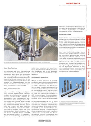 TECHNOLOGIEFR%u00c4SEN BOHREN DREHEN STECHEN INDUSTRIENSmart ManufacturingDie Ausrichtung auf Smart Manufacturing setzt voraus, dass die Konstrukteure die Digitalisierung beim Design von Fr%u00e4sprozess und -werkzeug integrieren. Dabei sind digitale Zwillinge und entsprechende Softwareanwendungen bereits heute ein Muss f%u00fcr ein umfassendes Werkzeugangebot. Wie sich die Hersteller von Schneidwerkzeugen den sich aktuell abzeichnenden Herausforderungen stellen, zeigen die L%u00f6sungen von ISCAR.Nuten, Taschen, Hohlr%u00e4umeBeim trochoidalen Hochgeschwindigkeitsfr%u00e4sen folgt das Werkzeug einer gekr%u00fcmmten Bahn, um eine konstante Belastung der Schneide aufrechtzuerhalten. Pl%u00f6tzliche Belastungsspitzen beim Materialeintritt werden vermieden. Diese Strategie ist sehr effizient beim Fr%u00e4sen von tiefen Nuten, Taschen und Hohlr%u00e4umen, insbesondere bei geringer Bearbeitungsstabilit%u00e4t. Dar%u00fcber hinaus liefert das Verfahren sehr gute Ergebnisse bei der Bearbeitung anspruchsvoller Werkst%u00fcckstoffe wie legierten St%u00e4hlen oder hoch hitzebest%u00e4ndigen Superlegierungen. Speziell f%u00fcr das trochoidale Fr%u00e4sen hat ISCAR das CHATTERFREE EC-E7/H7-CF-Produktprogramm f%u00fcr mehrschneidige Vollhartmetall(VHM)-Fr%u00e4ser entwickelt. Das geometrische Design der Werkzeuge umfasst unterschiedliche Spiralwinkel und variable Winkelsteigungen, die das dynamische Schnittverhalten verbessern.Hochproduktiv und effektivMithilfe moderner Maschinen ist das hochproduktive Fr%u00e4sen von Aluminiumlegierungen bei extrem hohen Spindeldrehzahlen von bis zu 33.000 Umdrehungen pro Minute m%u00f6glich. Um dieser Herausforderung gerecht zu werden, hat ISCAR 90-Grad-Fr%u00e4ser entwickelt, die gro%u00dfformatige WSP mit einer Schnitttiefe von bis zu 22 Millimetern aufnehmen k%u00f6nnen.Die Fr%u00e4ser sind so konstruiert, dass keine radiale Verschiebung der Wendeschneidplatte erfolgt, was bei sehr hohen Drehzahlen aufgrund der hohen Fliehkr%u00e4fte auftreten kann.Das Hochvorschubfr%u00e4sen hat sich zu einem weit verbreiteten Verfahren zum effizienten Schruppen von komplexen Oberfl%u00e4chen entwickelt. ISCAR bietet daf%u00fcr eine breite Werkzeugpalette an. Die charakteristischen knochenf%u00f6rmigen WSP der LOGIQ4FEED-Familie gibt es beispielsweise jetzt auch in gr%u00f6%u00dferen Ausf%u00fchrungen. Sie erweitern den Anwendungsbereich erheblich, insbesondere beim Hochvorschubfr%u00e4sen von tiefen Kavit%u00e4ten im Die LOGIQ4FEED-Fr%u00e4ser erweitern die M%u00f6glichkeiten bei der Bearbeitung von Gesenk- und Formkavit%u00e4ten.Werkzeug- und Formenbau. Eine weitere Neuerung sind die wirtschaftlichen NEOFEED-Fr%u00e4ser mit ihren doppelseitigen, quadratischen Wendeplatten mit acht Schneidenkanten.Pr%u00e4zise und schnellFortschritte bei mehrachsigen Werkzeugmaschinen und CAD/CAM-Systemen erlauben das pr%u00e4zise Fr%u00e4sen komplexer Formen mit minimalem Abtrag des Werkst%u00fcckstoffs durch segment- oder tonnenf%u00f6rmige Schaftfr%u00e4ser. Diese sind als VHM-Versionen, als MULTI-MASTERFr%u00e4sk%u00f6pfe oder als Ausf%u00fchrung mit einer Wendeschneidplatte verf%u00fcgbar.Beim Fr%u00e4sen hoch hitzebest%u00e4ndiger Superlegierungen kann der Anwender mit Schneiden aus keramischen Werkstoffen die Schnittgeschwindigkeiten erheblich erh%u00f6hen %u2013 bis zu 1.000 Meter pro Minute sind m%u00f6glich. Zu den neuesten Keramikwerkzeugen von ISCAR geh%u00f6ren keramische VHM- und WSP-Fr%u00e4ser mit doppelseitigen, runden Keramikeins%u00e4tzen.Das doppelseitige Design zielt darauf ab, die Nutzung keramischer Werkstoffe zu maximieren, wie beispielsweise schwarze Keramik, whiskerverst%u00e4rkte Keramik und SiAlON %u2013 eine Art Keramik auf Siliziumnitridbasis.ISCAR hat Tonnenfr%u00e4ser als VHM-Versionen, als MULTIMASTER-Fr%u00e4sk%u00f6pfe oder als Ausf%u00fchrung mit einer Wendeschneidplatte im Programm.21