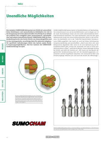 NEUFR%u00c4SEN BOHREN DREHEN STECHEN INDUSTRIENBei den SUMOCHAM-Bohrk%u00f6pfen hat der Anwender zahlreiche Modifikationsm%u00f6glichkeiten: Abweichende Durchmesser, spezielle Spitzenwinkel, kleine Stufen, besondere Eckenradien oder auch alternative Beschichtungen sind m%u00f6glich.ISCARs SUMOCHAM-System bietet im Standard Bohrer mit Wechselk%u00f6pfen in Durchmessern von vier bis 32,9 Millimetern und in L%u00e4ngen von 1,5 bis 12xD.Unendliche M%u00f6glichkeitenDas modulare SUMOCHAM-Bohrsystem von ISCAR mit unterschiedlichen Bohrk%u00f6rpern und auswechselbaren Bohrk%u00f6pfen hat sich in der Zerspanung seit vielen Jahren bew%u00e4hrt. Das Prinzip ist so einfach wie praktisch und erm%u00f6glicht einen prozesssicheren, wirtschaftlichen und nahezu r%u00fcstzeitfreien Einsatz. SUMOCHAM erf%u00fcllt im Standardumfang bereits eine breite Palette von Anwendungsf%u00e4llen und ist eine leistungsstarke, zuverl%u00e4ssige Basis f%u00fcr zahlreiche Aufgaben. F%u00fcr spezifische Anforderungen bietet das System zudem flexible Anpassungsm%u00f6glichkeiten. Und hier kommen die SUMOCHAMSonderwerkzeuge ins Spiel. ISCARs SUMOCHAM-System bietet im Standard Bohrer mit Wechselk%u00f6pfen in Durchmessern von vier bis 32,9 Millimetern und in L%u00e4ngen von 1,5 bis 12xD. Die Bohrk%u00f6rper lassen sich mit zw%u00f6lf unterschiedlichen Bohrkopf-Geometrien best%u00fccken. F%u00fcr hohe Standzeiten und eine sehr gute Spankontrolle sorgt eine innere K%u00fchlmittelzufuhr direkt in die Schnittzone. Die Bohrk%u00f6pfe sind in der TiAlN-PVD beschichteten Feinstkornsorte IC908 ausgef%u00fchrt. Das macht sie auch bei hohen Schnittwerten temperaturbest%u00e4ndig und verschlei%u00dffest. %u201eDamit sind schon sehr viele Bohrprozesse abgedeckt, aber wenn es um eine Optimierung auf Sekundenbruchteile geht, kommt der Anwender oft nicht an einer Sonderkonstruktion vorbei%u201c, wei%u00df Patrick Muller, Product Manager Drilling bei ISCAR, und z%u00e4hlt die Vorteile auf: %u201eMit einem auf das Bauteil abgestimmten Sonderwerkzeug l%u00e4sst sich der Bearbeitungsprozess vereinfachen und die Eingriffszeit reduzieren. Der Aufwand f%u00fcr R%u00fcst- und Einfahrvorg%u00e4nge reduziert sich und auch die Anzahl der Werkzeuge.%u201c32