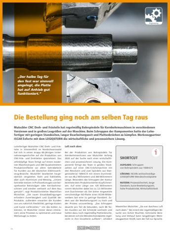 Die Bestellung ging noch am selben Tag rausMutschler CNC Dreh- und Fr%u00e4steile hat regelm%u00e4%u00dfig Bohrspindeln f%u00fcr Kernbohrmaschinen in verschiedenen Versionen und in gro%u00dfen Losgr%u00f6%u00dfen auf der Maschine. Beim Schruppen der Komponenten hatte der Lohnfertiger mit geringen Standzeiten, langer Bearbeitungszeit und Plattenbr%u00fcchen zu k%u00e4mpfen. Werkzeugpartner ISCAR lieferte mit dem LOGIQ6TURN die wirtschaftliche und prozesssichere L%u00f6sung.Lohnfertiger Mutschler CNC Dreh- und Fr%u00e4steile in Simmersfeld im Nordschwarzwald hat sich in seiner knapp 40-j%u00e4hrigen Unternehmensgeschichte auf die Produktion von CNC-Fr%u00e4s- und Drehteilen spezialisiert. Das zehnk%u00f6pfige Team fertigt auf einem modernen Maschinenpark und 380 Quadratmetern Produktionsfl%u00e4che vor allem Getriebeteile f%u00fcr Kunden aus der deutschen Elektrowerkzeug-Branche. Mutschler bearbeitet haupts%u00e4chlich verg%u00fcteten Stahl und Edelst%u00e4hle, aber auch Aluminium und Messing. %u201eUnsere Getriebe stecken in Profiwerkzeugen wie beispielsweise Betons%u00e4gen oder Kernbohrmaschinen und werden weltweit auf dem Bau genutzt%u201c, sagt Produktionsleiter Maximilian Mutschler. %u201eDie rauen Einsatzbedingungen erfordern Zuverl%u00e4ssigkeit und Qualit%u00e4t der Produkte, au%u00dferdem erwarten die Kunden von uns nat%u00fcrlich Flexibilit%u00e4t, geringe Kosten und kurze Lieferzeiten.%u201c Um das bieten zu k%u00f6nnen, ist Mutschler immer daran interessiert, seine Prozesse zu optimieren und neue Werkzeuge zu testen.Luft nach obenBei der Produktion von Bohrspindeln f%u00fcr Kernbohrmaschinen war Mutschler Anfang 2024 auf der Suche nach einer wirtschaftlichen und prozesssicheren L%u00f6sung. Die Komponente fertigt das Team in gro%u00dfen St%u00fcckzahlen auf einer CNC-5-Achsmaschine mit drei Revolvern und zwei Spindeln aus Stangenmaterial 16MnCr5 mit einem Durchmesser von 40,2 Millimetern und 300 Millimetern L%u00e4nge. Besonders das Schruppen der Kontur bereitete dem Produktionsleiter Kopfschmerzen. Auf einer L%u00e4nge von 120 Millimetern nimmt Mutschler dabei bis zu 2,5 Millimeter vom Durchmesser ab. Die bisher eingesetzte vierschneidige ISO-Platte eines ISCAR-Mitbewerbers bot eine zu geringe Standzeit. Zudem war die Bearbeitungszeit zu hoch und der Prozess unzuverl%u00e4ssig. %u201eDas Schruppen dauerte pro Teil 26 Sekunden, nach 80 Teilen mussten wir die Schneide wechseln und hatten dazu noch regelm%u00e4%u00dfig Plattenbr%u00fcche, bei denen sich die Wendeschneidplatte regelrecht in ihre Einzelteile aufl%u00f6ste%u201c, schildert Maximilian Mutschler. %u201eDa war durchaus Luft nach oben.%u201c Bei einem der regelm%u00e4%u00dfigen Besuche von Achim Wuchter, technische Beratung und Verkauf beim langj%u00e4hrigen Werkzeugpartner ISCAR, kam der Fall zur Sprache.%u201eDer halbe Tag f%u00fcr den Test war sinnvoll angelegt, die Platte hat auf Anhieb gut funktioniert.%u201cSHORTCUTAUFGABE: Schruppen von Bohrspindeln aus 16MnCr5 L%u00d6SUNG: ISCARs sechsschneidige LOGIQ6TURN-Wendeschneidplatte NUTZEN: Prozesssicherheit, lange Standzeit, kurze Bearbeitungszeit, hohe Produktivit%u00e4t, Wirtschaftlichkeit i36