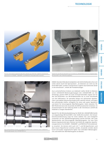 FR%u00c4SEN BOHREN DREHEN STECHEN INDUSTRIENTECHNOLOGIEDNMG-Standard-Wendeschneidplatten die K%u00fchlmittelkan%u00e4le schon seit vielen Jahren durch die Spannpratzen. %u201eSo klemmen wir nicht nur die Dreh-WSP stabil, sondern transportieren zugleich das K%u00fchlmittel direkt in die Schnittzone%u201c, erkl%u00e4rt der Produktmanager.Zum wirtschaftlichen Drehen von Edelstahl stellte ISCAR im Rahmen seiner LOGIQUICK-Werkzeugkampagne den LOGIQ6TURN vor. Die dreieckige, positive WSP mit sechs 55-Grad-Schneiden eignet sich f%u00fcr das (Vor-)Schlichten von ISO-M-Werkstoffen bis zu einer Schnitttiefe von drei Millimetern. Ihr spezielles Design mit optimierten Spanbrechern und stabiler Klemmung erlaubt einen weichen Schnitt, verringert die auftretenden Kr%u00e4fte, erm%u00f6glicht f%u00fcr einen sehr guten Spanbruch und damit f%u00fcr hervorragende Oberfl%u00e4cheng%u00fcten. Dank robustem TNMG-Plattensitz kann der Anwender die WSP prozesssicher einsetzen. Im Zusammenspiel mit der K%u00fchlung direkt in der Schnittzone verhilft die Stabilit%u00e4t zu langen Standzeiten.Speziell f%u00fcr die Miniaturbearbeitung hat ISCAR die LOGIQ4TURN-Familie um doppelseitige 80-Grad-WSP in der Gr%u00f6%u00dfe 06 erweitert. Die Schwalbenschwanzklemmung sorgt f%u00fcr einen stabilen Sitz und erm%u00f6glicht zusammen mit der Spanbrechergeometrie weiche Schnitte, sehr gute Spankontrolle und hervorragende Oberfl%u00e4cheng%u00fcten. F%u00fcr eine noch bessere Spankontrolle beim Stechen hat ISCAR die m%u00f6glichen Spanformergeometrien f%u00fcr DOGRIP-, TANGGRIP- und PENTACUT-Schneideins%u00e4tze erweitert. Sie k%u00f6nnen jetzt auch mit T- und NX-Spanformern und dem neuen B-Spanformer versehen werden. Anwender erzielen damit kurze und sauber eingeschn%u00fcrte Sp%u00e4ne. Das verhindert Werkzeugbr%u00fcche und erh%u00f6ht die Oberfl%u00e4cheng%u00fcten am Bauteil.F%u00fcr eine noch bessere Spankontrolle beim Stechen hat ISCAR die m%u00f6glichen Spanformergeometrien f%u00fcr DOGRIP-, TANGGRIP- und PENTACUT-Schneideins%u00e4tze erweitert.Speziell f%u00fcr die Miniaturbearbeitung hat ISCAR die LOGIQ4TURN-Familie mit doppelseitigen80-Grad-WSP in der Gr%u00f6%u00dfe 06 ausgebaut.Zum wirtschaftlichen Drehen von Edelstahl stellte ISCAR im Rahmen seiner LOGIQUICKWerkzeugkampagne den LOGIQ6TURN vor.63