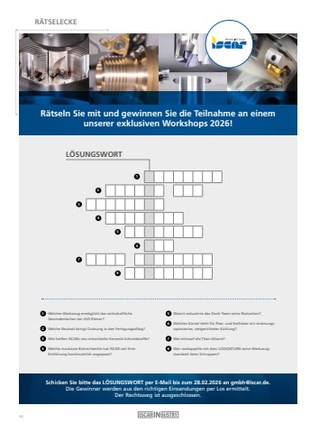 R%u00c4TSELECKER%u00e4tseln Sie mit und gewinnen Sie die Teilnahme an einem unserer exklusiven Workshops 2026!Schicken Sie bitte das L%u00d6SUNGSWORT per E-Mail bis zum 28.02.2026 an [email protected]. Die Gewinner werden aus den richtigen Einsendungen per Los ermittelt.Der Rechtsweg ist ausgeschlossen.L%u00d6SUNGSWORT312568741 Welches Werkzeug erm%u00f6glicht das wirtschaftliche Gewindestechen bei AVS R%u00f6mer? 2 Welche Neuheit bringt Ordnung in den Fertigungsalltag?3 Wie hei%u00dfen ISCARs neu entwickelte Keramik-Schneidstoffe? 4 Welche modulare Bohrerfamilie hat ISCAR seit ihrer Einf%u00fchrung kontinuierlich angepasst? 5 Womit reduzierte das Stork-Team seine R%u00fcstzeiten? 6 Welches K%u00fcrzel steht f%u00fcr Plan- und Eckfr%u00e4ser mit str%u00f6mungsoptimierter, zielgerichteter K%u00fchlung?7 Wer entwarf die Titan-Gitarre? 8 Wer verdoppelte mit dem LOGIQ6TURN seine Werkzeugstandzeit beim Schruppen?66