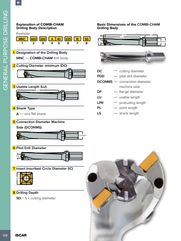 128 ISCAR GENERAL PURPOSE DRILLINGExplanation of COMBI-CHAM Drilling Body Description Example:MNC 400 - 200 A 40 - 225 - 10 - 5D1 2 3 4 5 6 7 81 Designation of the Drilling BodyMNC %u2014 COMBI-CHAM drill body2 Cutting Diameter minimum (DC)DC3 Usable Length (LU) LU4 Shank TypeA %u2014 one flat shank5 Connection Diameter Machine Side (DCONMS)DCONMS6 Pilot Drill Diameter PDD7 Insert Inscribed Circle Diameter (IC) IC8 Drilling Depth5D = 5 x cutting diameterBasic Dimensions of the COMBI-CHAMDrilling BodyDFPL LPR LSDC PDDLUDCONMSDC %u2014 cutting diameterPDD %u2014 pilot drill diameter DCONMS %u2014 connection diameter machine sideDF %u2014 flange diameterLU %u2014 usable lengthLPR %u2014 protruding lengthPL %u2014 point lengthLS %u2014 shank length