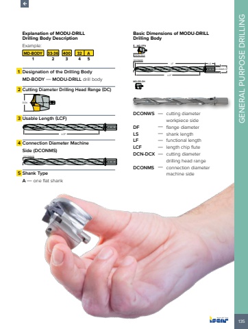 135GENERAL PURPOSE DRILLINGExplanation of MODU-DRILL Drilling Body Description Example:MD-BODY 33-36 400 32 A1 2 3 4 51 Designation of the Drilling BodyMD-BODY %u2014 MODU-DRILL drill body2 Cutting Diameter Drilling Head Range (DC) DCN3 Usable Length (LCF) LCF4 Connection Diameter Machine Side (DCONMS) DCONWS5 Shank TypeA %u2014 one flat shankBasic Dimensions of MODU-DRILL Drilling BodyDCN-DCXMD-DFNLF LSLCFDCONMS DFDCONWSMD-DR-DHDCONWS %u2014 cutting diameter workpiece sideDF %u2014 flange diameterLS %u2014 shank lengthLF %u2014 functional lengthLCF %u2014 length chip fluteDCN-DCX %u2014 cutting diameter drilling head rangeDCONMS %u2014 connection diameter machine side