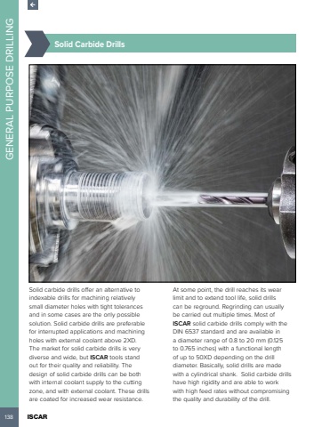 138 ISCAR GENERAL PURPOSE DRILLING %u00bd%u0009Solid Carbide DrillsSolid carbide drills offer an alternative to indexable drills for machining relatively small diameter holes with tight tolerances and in some cases are the only possible solution. Solid carbide drills are preferable for interrupted applications and machining holes with external coolant above 2XD. The market for solid carbide drills is very diverse and wide, but ISCAR tools stand out for their quality and reliability. The design of solid carbide drills can be both with internal coolant supply to the cutting zone, and with external coolant. These drills are coated for increased wear resistance. At some point, the drill reaches its wear limit and to extend tool life, solid drills can be reground. Regrinding can usually be carried out multiple times. Most of ISCAR solid carbide drills comply with the DIN 6537 standard and are available in a diameter range of 0.8 to 20 mm (0.125 to 0.765 inches) with a functional length of up to 50XD depending on the drill diameter. Basically, solid drills are made with a cylindrical shank. Solid carbide drills have high rigidity and are able to work with high feed rates without compromising the quality and durability of the drill.