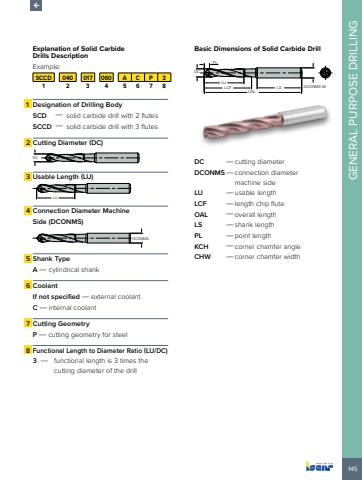 145GENERAL PURPOSE DRILLINGExplanation of Solid Carbide Drills Description Example:SCCD 040 017 060 A C P 31 2 3 4 5 6 7 81 Designation of Drilling BodySCD %u2014 solid carbide drill with 2 flutesSCCD %u2014 solid carbide drill with 3 flutes2 Cutting Diameter (DC) DC3 Usable Length (LU) LU4 Connection Diameter MachineSide (DCONMS) DCONMS5 Shank TypeA %u2014 cylindrical shank6 CoolantIf not specified %u2014 external coolantC %u2014 internal coolant7 Cutting GeometryP %u2014 cutting geometry for steel8 Functional Length to Diameter Ratio (LU/DC)3 %u2014 functional length is 3 times the cutting diameter of the drillBasic Dimensions of Solid Carbide DrillDCONMS h6DCOALLCF LSPLLUDC %u2014 cutting diameter DCONMS %u2014 connection diameter machine sideLU %u2014 usable lengthLCF %u2014 length chip fluteOAL %u2014 overall lengthLS %u2014 shank lengthPL %u2014 point lengthKCH %u2014 corner chamfer angleCHW %u2014 corner chamfer width