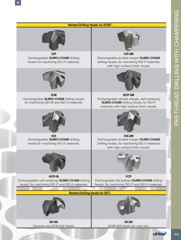 159PRE-THREAD DRILLING WITH CHAMFERING Related Drilling Heads for DCNT %u2026ICPExchangeable SUMO-CHAM drilling heads for machining ISO P materials.ICP-2M Exchangeable double margin SUMO-CHAMdrilling heads, for machining ISO P materials with high surface finish results.ICM Exchangeable SUMO-CHAM drilling heads for machining ISO M and ISO S materials.QCP-2MExchangeable double margin, self-centering SUMO-CHAM drilling heads, for ISO P materials with high surface finish results.ICKExchangeable SUMO-CHAM drilling heads for machining ISO K materials.ICK-2M Exchangeable double margin SUMO-CHAMDrilling heads, for machining ISO K materials with high surface finish results.HCP-IQExchangeable self-centering SUMO-CHAM drilling heads, for machining ISO P and ISO K materials.FCPExchangeable flat bottom SUMO-CHAM drilling heads, for machining ISO P and ISO K materials.Related Drilling Heads for DCT %u2026IDI-SGGeneral use DCM drill heads.IDI-SKDCM drill heads for cast iron.
