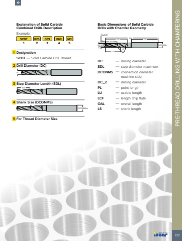 177PRE-THREAD DRILLING WITH CHAMFERING Explanation of Solid Carbide Combined Drills Description Example:SCDT 025 - 009 - 060 - M31 2 3 4 51 DesignationSCDT %u2014 Solid Carbide Drill Thread2 Drill Diameter (DC)DC3 Step Diameter Lendth (SDL)SDL4 Shank Size (DCONMS)DCONMSh65 For Thread Diameter SizeBasic Dimensions of Solid CarbideDrills with Chamfer GeometryDC140%u00b0PL SDLDC_2 m7LCF OAL45%u00b0LULSDCONMSh6DC %u2014 drilling diameterSDL %u2014 step diameter maximumDCONMS %u2014 connection diameter machine sideDC_2 %u2014 drilling diameterPL %u2014 point lengthLU %u2014 usable lengthLCF %u2014 length chip fluteOAL %u2014 overall lengthLS %u2014 shank length