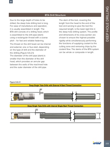 233DEEP HOLE DRILLINGBTA Drill StructureDue to the large depth of holes to be drilled, the deep hole drilling tool is long. For ease of manufacture and operation, it is usually assembled in length. The BTA drill consists of a drilling head, which is assembled to the drill pipe (stem) using a rectangular thread with a coarse pitch - for fast and reliable fastening.The thread on the drill head can be internal and external, one or four-start, depending on the type of drill and the diameter of the drilling (Figure 6.6.2.1). The diameter of the drill pipe (stem) is smaller than the diameter of the drill head, which provides an annular gap between the walls of the machined hole and the outer diameter of the drill pipe.The stem of the tool, covering the length from the head to the end of the tool and serving to give the tool the required length, is the least rigid link in the deep hole drilling system. The profile and dimensions of its cross-section are chosen to ensure the highest possible rigidity while simultaneously performing the functions of supplying coolant to the cutting zone and removing chips by the coolant flow. The stems of the BTA system can be whole or composite in length.Figure 6.6.2.1Deep Single Tube Drills with External 4-Start Thread ConnectiondgapDDeep Single Tube Drills with Internal Single-Start Thread ConnectionD dgap