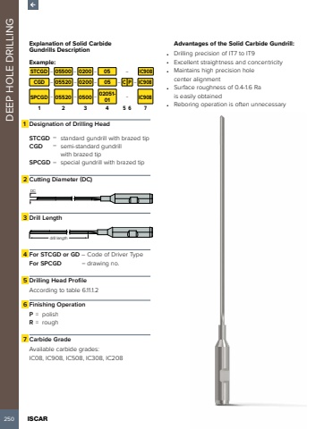 250 ISCAR DEEP HOLE DRILLINGExplanation of Solid Carbide Gundrills DescriptionExample:STCGD %u2013 05500 %u2013 0200 %u2013 05 %u2013 IC908CGD %u2013 05520 %u2013 0200 %u2013 05 %u2013 C P %u2013 IC908SPCGD %u2013 05520 %u2013 0500 %u2013 02051-01 %u2013 IC9081 2 3 4 5 6 71 Designation of Drilling HeadSTCGD %u2013 standard gundrill with brazed tipCGD %u2013 semi-standard gundrill with brazed tipSPCGD %u2013 special gundrill with brazed tip2 Cutting Diameter (DC)DC3 Drill Lengthdrill length4 For STCGD or GD %u2013 Code of Driver TypeFor SPCGD %u2013 drawing no.5 Drilling Head ProfileAccording to table 6.11.1.26 Finishing OperationP = polishR = rough7 Carbide GradeAvailable carbide grades: IC08, IC908, IC508, IC308, IC208Advantages of the Solid Carbide Gundrill: %u2022 Drilling precision of IT7 to IT9%u2022 Excellent straightness and concentricity%u2022 Maintains high precision hole center alignment%u2022 Surface roughness of 0.4-1.6 Ra is easily obtained%u2022 Reboring operation is often unnecessary