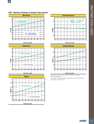 277DEEP HOLE DRILLINGDTS - Machine Setting for Double Tube SystemNet PowerPc (kW)18 19 20 21 22 23 24 25 26 27 28109876543210Vc = 100 m/minf = 0.25 mm/revVc = 70 m/minf = 0.25 mm/revDrill dia. (mm)Feed ForceFf (kN)18 19 20 21 22 23 24 25 26 27 281086420f = 0.25 mm/revf = 0.15 mm/revDrill dia. (mm)TorqueT (kNm)18 19 20 21 22 23 24 25 26 27 280.10.080.060.040.020f = 0.25 mm/revf = 0.15 mm/revDrill dia. (mm)Coolant PressureP (MPa)18 19 20 21 22 23 24 25 26 27 2832.521.510.51MPa = 1.0 N/mm21Mpa %u2248 10 atmDrill dia. (mm)Coolant Volumeq (l/min)18 19 20 21 22 23 24 25 26 27 281201008060400Drill dia. (mm)The above values should not be used as the exact recommendations. They may need modification depending on the machining conditions, materials, etc.