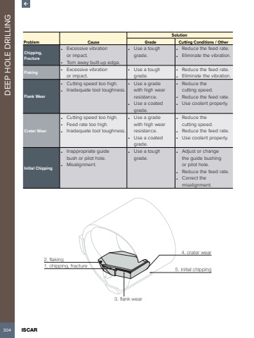 304 ISCAR DEEP HOLE DRILLINGProblem CauseSolutionGrade Cutting Conditions / OtherChipping,Fracture%u2022 Excessive vibration or impact. %u2022 Torn away built-up edge. %u2022 Use a tough grade. %u2022 Reduce the feed rate. %u2022 Eliminate the vibration. Flaking %u2022 Excessive vibration or impact. %u2022 Use a tough grade. %u2022 Reduce the feed rate. %u2022 Eliminate the vibration. Flank Wear%u2022 Cutting speed too high. %u2022 Inadequate tool toughness. %u2022 Use a grade with high wear resistance. %u2022 Use a coated grade. %u2022 Reduce the cutting speed. %u2022 Reduce the feed rate. %u2022 Use coolant properly. Crater Wear%u2022 Cutting speed too high. %u2022 Feed rate too high. %u2022 Inadequate tool toughness. %u2022 Use a grade with high wear resistance. %u2022 Use a coated grade. %u2022 Reduce the cutting speed. %u2022 Reduce the feed rate. %u2022 Use coolant properly. Initial Chipping%u2022 Inappropriate guide bush or pilot hole. %u2022 Misalignment. %u2022 Use a tough grade. %u2022 Adjust or change the guide bushing or pilot hole. %u2022 Reduce the feed rate. %u2022 Correct the misalignment. 4. crater wear5. initial chipping3. flank wear1. chipping, fracture2. flaking