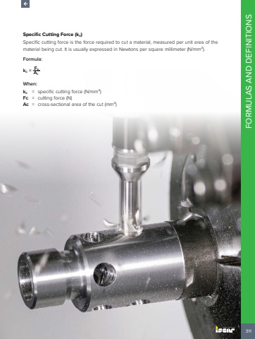 311FORMULAS AND DEFINITIONSSpecific Cutting Force (kc)Specific cutting force is the force required to cut a material, measured per unit area of the material being cut. It is usually expressed in Newtons per square millimeter (N/mm%u00b2).Formula:kc =  Fc AcWhen:kc = specific cutting force (N/mm%u00b2)Fc = cutting force (N)Ac = cross-sectional area of the cut (mm%u00b2)