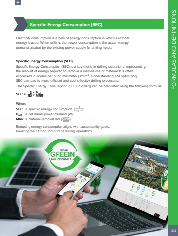 313FORMULAS AND DEFINITIONS%u00bd%u0009Specific Energy Consumption (SEC)Electricity consumption is a form of energy consumption in which electrical energy is used. When drilling, the power consumption is the actual energy demand created by the existing power supply for drilling holes.Specific Energy Consumption (SEC)Specific Energy Consumption (SEC) is a key metric in drilling operations, representing the amount of energy required to remove a unit volume of material. It is often expressed in Joules per cubic millimeter (J/mm%u00b3). Understanding and optimizing SEC can lead to more efficient and cost-effective drilling processes.The Specific Energy Consumption (SEC) in drilling can be calculated using the following formula:SEC = 3 %u00d7 Pnet 50 %u00d7 MRR When:SEC = specific energy consumption ( J  mm3 )Pnet = net mean power demand (W)MRR = material removal rate ( cm3min )Reducing energy consumption aligns with sustainability goals, lowering the carbon footprint of drilling operations.SUSTAINABILITYISCARGREEIN