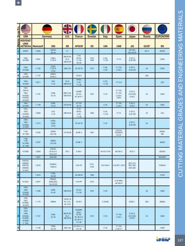 327CUTTING MATERIAL GRADES AND ENGINEERING MATERIALS Material Group No.USA Germany U.K. France Sweden Italy Spain Japan Russia EURONORMAISI/SAE/UNS/ASTM/AA Werkstoff DIN BS AFNOR SS UNI UNE JIS GOST EN1 J03001 1.0446 GE240;GS-45 A 1 230-450;230-450 W 25L-3 GE2402 1035;G10350 1.0501 C35G;C 35 G080 M 30;En 5;080 M 36C 35;AF 55;1 C 35;XC 381572;1550C 35;1 C 35 F.113 S 35 C;S 35 CM C35G2 1035;G10350 1.1183C35G;C 35 G;Cf 35080 A 35 XC 38 TS 1572 C 36;C 38F.1130;C 35 kS 35 C;S 35 CM 35 C35G2 1039;G10390 1.1157 40Mn4;40 Mn 4 35 M 5 40G2 1040;G10400 1.0511 C40;C 40En 8;080 M 40AF 60;C 40;1 C 40C 40;1 C 40 F.114.A C4021045;1045 H;1042;G10450;H10450;G104201.1191 C45E;Ck 45080 H 46;080 M 46C45RR;XC 45;XC 48 H-11672 C 45F.1140;F.1142;C 45 k;C48 kS 45 C;S 45 CM;S 48 C45 C45E2 1025;G10250 1.1158 C25E;Ck 25 070 M 26 2 C 25;XC 25 C 25 F.1120;C 25 kS 25 C;S 28 C 25 C25E21043;1045;G10430;G104501.0503 C45;C 45 080 M 46C 45;AF 65;C 45;1 C 451650 C 45;1 C 45 F.114 S 45 C;S 45 CM 45 C4521050;1055;G10500;G105501.1213C53G;C53E;Cf 53XC 48 TS C 53 S 50 C;S 50 CM 502 1140;G11400 1.0726 35S20;35 S 20 212 M 36 35 MF 4 1957F.210.G;35 MnS 6;F.213135S20;8M21139;1146;G11390;G114601.0727 46S20;45 S 20 45 MF 4 46S202 K12000 1.0553S355J0;St 52-3 U;Fe 510-C50 C E 36-3 Fe 510 C FN AE 355 C SCC 3 S355J02 1.0551 S355JRC S355JRC 2K02700;K02803;K03103;K03300;K124371.0473 P355GH;19 Mn 6 A 52 CP 2101;2102 Fe E 355-2 A 52 RC I, RA IISGV 410;SGV 450;SGV 480P355GH2 1.0416 C18D;GS-38 20-400 M 1306 C18D2 K12447 1.0577S355J2;S355J2G4;Fe 510 D2A 52 FP 2107 A 52 RB II;AE 355 D21049;1050;G10490;G105001.1206 C50E;Ck 50 080 M 50 XC 50;2 C 50 1674 C 50 50 C50E21330;1527;G13300;G152701.1170 28Mn6150 M 19;En 14 A;En 14 B20 M 5 C 28 Mn SCMn 1 30G 28Mn621034;1035;1038;G10340;G10350;G10380;C 10341.1181 C35E;Ck 35080 M 30;En 5;080 M 36XC35RR;XC32;XC 35;XC 38 H 2;XC 38 H 1;2 C 351572 C 35 F.1130;C 35 kS 35 C;S 35 CM;S 38 C35 C35E2 1.1180 C35R;Cm 35 080 A 35 XC 38 H 1 u;Cm 35 C 35 F.1135;C 35 k-1 C35R