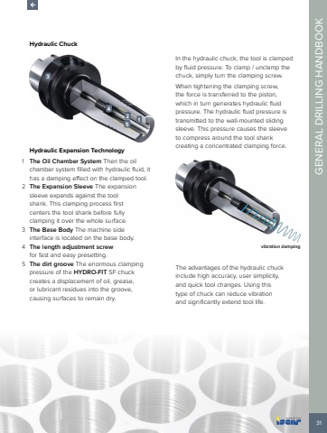 31GENERAL DRILLING HANDBOOKHydraulic Chuck12543Hydraulic Expansion Technology1 The Oil Chamber System Then the oil chamber system filled with hydraulic fluid, it has a damping effect on the clamped tool.2 The Expansion Sleeve The expansion sleeve expands against the tool shank. This clamping process first centers the tool shank before fully clamping it over the whole surface.3 The Base Body The machine side interface is located on the base body.4 The length adjustment screwfor fast and easy presetting.5 The dirt groove The enormous clamping pressure of the HYDRO-FIT SF chuck creates a displacement of oil, grease, or lubricant residues into the groove, causing surfaces to remain dry.In the hydraulic chuck, the tool is clamped by fluid pressure. To clamp / unclamp the chuck, simply turn the clamping screw. When tightening the clamping screw, the force is transferred to the piston, which in turn generates hydraulic fluid pressure. The hydraulic fluid pressure is transmitted to the wall-mounted sliding sleeve. This pressure causes the sleeve to compress around the tool shank creating a concentrated clamping force. vibration dampingThe advantages of the hydraulic chuck include high accuracy, user simplicity, and quick tool changes. Using this type of chuck can reduce vibration and significantly extend tool life.