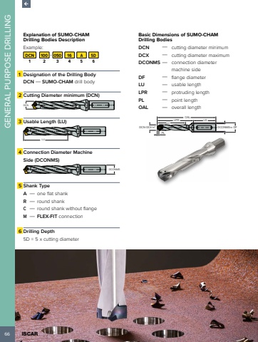 66 ISCAR GENERAL PURPOSE DRILLINGExplanation of SUMO-CHAM Drilling Bodies Description Example:DCN 100 - 050 16 A 5D1 2 3 4 5 61 Designation of the Drilling BodyDCN %u2014 SUMO-CHAM drill body2 Cutting Diameter minimum (DCN)DCN3 Usable Length (LU) LU4 Connection Diameter Machine Side (DCONMS) DCONMS5 Shank TypeA %u2014 one flat shankR %u2014 round shankC %u2014 round shank without flangeM %u2014 FLEX-FIT connection6 Drilling Depth5D = 5 x cutting diameterBasic Dimensions of SUMO-CHAM Drilling BodiesDCN %u2014 cutting diameter minimumDCX %u2014 cutting diameter maximumDCONMS %u2014 connection diameter machine sideDF %u2014 flange diameterLU %u2014 usable lengthLPR %u2014 protruding lengthPL %u2014 point lengthOAL %u2014 overall lengthLPROALLSDCONMSh6 DFLUPLDCN-DCX k7