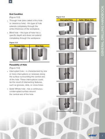 7 GENERAL DRILLING HANDBOOKEnd Condition (Figure 1.1.2) %u2022 Through hole (also called a thru-hole or clearance hole) - this type of hole extends completely through the entire thickness of the workpiece.%u2022 Blind hole %u2013 this type of hole has a specific depth and does not extend completely through the workpiece.Figure 1.1.2 Through Hole Blind HolePassability of Hole (Figure 1.1.3)%u2022 Interrupted hole %u2013 is characterized by one or more interruptions or recesses along the surface surrounding the central axis of the hole. These interruptions could be the result of intersecting features, such as grooves, slots, or cross-holes.%u2022 Solid/ Whole hole - has a continuous, uninterrupted surface around the central axis of the hole.Figure 1.1.3Interrupted Hole Solid / Whole Hole