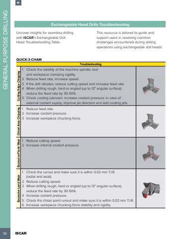 92 ISCAR GENERAL PURPOSE DRILLINGExchangeable Head Drills TroubleshootingUncover insights for seamless drilling with ISCAR%u2019s Exchangeable Drill Head Troubleshooting Table. This resource is tailored to guide and support users in resolving common challenges encountered during drilling operations using exchangeable drill heads.QUICK-3-CHAMTroubleshootingCutting Edge Chipping1 Check the stability of the machine spindle, tool and workpiece clamping rigidity.2 Reduce feed rate, increase speed.3 If the drill vibrates, reduce cutting speed and increase feed rate.4 When drilling rough, hard or angled (up to 12%u00b0 angular surface), reduce the feed rate by 30-50%.5 Check cooling lubricant. increase coolant pressure. in case of external coolant supply, improve jet direction and add cooling jets.Chisel Area Chipping1 Reduce feed rate.2 Increase coolant pressure.3 Increase workpiece chucking force.Excessive Flank Wear 1 Reduce cutting speed.2 Increase internal coolant pressure.Excessive Land Wear1 Check the runout and make sure it is within 0.02 mm T.I.R.(radial and axial).2 Reduce cutting speed.3 When drilling rough, hard or angled (up to 12%u00b0 angular surface), reduce the feed rate by 30-50%.4 Increase coolant pressure.5 Check the chisel point runout and make sure it is within 0.02 mm T.I.R.6 Increase workpiece chucking force stability and rigidity.