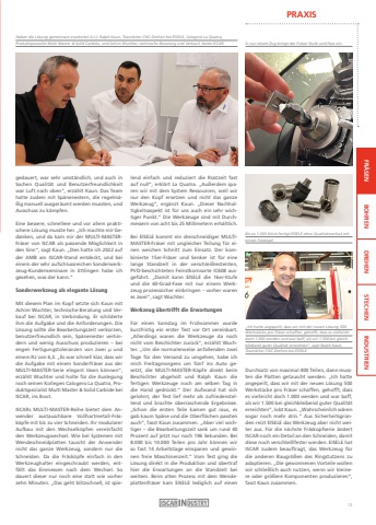 PRAXISFR%u00c4SEN BOHREN DREHEN STECHEN INDUSTRIENgedauert, war sehr umst%u00e4ndlich, und auch in Sachen Qualit%u00e4t und Benutzerfreundlichkeit war Luft nach oben%u201c, erz%u00e4hlt Kaun. Das Team hatte zudem mit Sp%u00e4nenestern, die regelm%u00e4%u00dfig manuell ausger%u00e4umt werden mussten, und Ausschuss zu k%u00e4mpfen.Eine bessere, schnellere und vor allem praktischere L%u00f6sung musste her. %u201eIch machte mir Gedanken, und da kam mir der MULTI-MASTERFr%u00e4ser von ISCAR als passende M%u00f6glichkeit in den Sinn%u201c, sagt Kaun. %u201eDen hatte ich 2022 auf der AMB am ISCAR-Stand entdeckt, und bei einem der sehr aufschlussreichen Sonderwerkzeug-Kundenseminare in Ettlingen habe ich gesehen, was der kann.%u201cSonderwerkzeug als elegante L%u00f6sungMit diesem Plan im Kopf setzte sich Kaun mit Achim Wuchter, technische Beratung und Verkauf bei ISCAR, in Verbindung. Er schilderte ihm die Aufgabe und die Anforderungen. Die L%u00f6sung sollte die Bearbeitungszeit verk%u00fcrzen, benutzerfreundlich sein, Sp%u00e4nenester verhindern und wenig Ausschuss produzieren %u2013 bei engen Fertigungstoleranzen von zwei %u00b5 und einem Rz von 6,3. %u201eEs war schnell klar, dass wir die Aufgabe mit einem Sonderfr%u00e4ser aus der MULTI-MASTER-Serie elegant l%u00f6sen k%u00f6nnen%u201c, erz%u00e4hlt Wuchter und holte f%u00fcr die Auslegung noch seinen Kollegen Calogero La Quatra, Produktspezialist Multi Master & Solid Carbide bei ISCAR, ins Boot.ISCARs MULTI-MASTER-Reihe bietet dem Anwender austauschbare Vollhartmetall-Fr%u00e4sk%u00f6pfe mit bis zu vier Schneiden. Ihr modularer Aufbau mit den Wechselk%u00f6pfen vereinfacht den Werkzeugwechsel. Wie bei Systemen mit Wendeschneidplatten tauscht der Anwender nicht das ganze Werkzeug, sondern nur die Schneiden. Da die Fr%u00e4sk%u00f6pfe einfach in den Werkzeughalter eingeschraubt werden, entf%u00e4llt das Einmessen nach dem Wechsel. So dauert dieser nur noch eine statt wie vorher zehn Minuten. %u201eDas geht blitzschnell, ist spielend einfach und reduziert die R%u00fcstzeit fast auf null%u201c, erkl%u00e4rt La Quatra. %u201eAu%u00dferdem sparen wir mit dem System Ressourcen, weil wir nur den Kopf ersetzen und nicht das ganze Werkzeug%u201c, erg%u00e4nzt Kaun. %u201eDieser Nachhaltigkeitsaspekt ist f%u00fcr uns auch ein sehr wichtiger Punkt.%u201c Die Werkzeuge sind mit Durchmessern von acht bis 25 Millimetern erh%u00e4ltlich.Bei EISELE kommt ein dreischneidiger MULTIMASTER-Fr%u00e4ser mit ungleicher Teilung f%u00fcr einen weichen Schnitt zum Einsatz. Der kombinierte 15er-Fr%u00e4ser und Senker ist f%u00fcr eine lange Standzeit in der verschlei%u00dfrestenten, PVD-beschichteten Feinstkornsorte IC608 ausgef%u00fchrt. %u201eDamit kann EISELE die 16er-Stufe und die 60-Grad-Fase mit nur einem Werkzeug prozesssicher einbringen %u2013 vorher waren es zwei%u201c, sagt Wuchter.Werkzeug %u00fcbertrifft die ErwartungenF%u00fcr einen Samstag im Fr%u00fchsommer wurde kurzfristig ein erster Test vor Ort vereinbart.%u201eAllerdings waren die Werkzeuge da noch nicht vom Beschichter zur%u00fcck%u201c, erz%u00e4hlt Wuchter. %u201eUm die normalerweise anfallenden zwei Tage f%u00fcr den Versand zu umgehen, habe ich mich Freitagmorgens um f%u00fcnf ins Auto gesetzt, die MULTI-MASTER-K%u00f6pfe direkt beim Beschichter abgeholt und Ralph Kaun die fertigen Werkzeuge noch am selben Tag in die Hand gedr%u00fcckt.%u201c Der Aufwand hat sich gelohnt, der Test lief mehr als zufriedenstellend und brachte %u00fcberraschende Ergebnisse.%u201eSchon die ersten Teile kamen gut raus, es gab kaum Sp%u00e4ne und die Oberfl%u00e4chen passten auch%u201c, fasst Kaun zusammen. %u201eAber viel wichtiger %u2013 die Bearbeitungszeit sank um rund 40 Prozent auf jetzt nur noch 196 Sekunden. Bei 8.000 bis 10.000 Teilen pro Jahr k%u00f6nnen wir so fast 14 Arbeitstage einsparen und gewinnen freie Maschinenzeit.%u201c Vom Test ging die L%u00f6sung direkt in die Produktion und %u00fcbertraf hier die Erwartungen an die Standzeit bei weitem. Beim alten Prozess mit dem Wendeplattenfr%u00e4ser kam EISELE lediglich auf einen Haben die L%u00f6sung gemeinsam erarbeitet (v.l.): Ralph Kaun, Teamleiter CNC-Drehen bei EISELE, Calogero La Quatra, Produktspezialist Multi Master & Solid Carbide, und Achim Wuchter, technische Beratung und Verkauf, beide ISCAR.Durchsatz von maximal 400 Teilen, dann mussten die Platten getauscht werden. %u201eIch hatte angepeilt, dass wir mit der neuen L%u00f6sung 500 Werkst%u00fccke pro Fr%u00e4ser schaffen, gehofft, dass es vielleicht doch 1.000 werden und war baff, als wir 1.500 bei gleichbleibend guter Qualit%u00e4t erreichten%u201c, lobt Kaun. %u201eWahrscheinlich w%u00e4ren sogar noch mehr drin.%u201c Aus Sicherheitsgr%u00fcnden reizt EISELE das Werkzeug aber nicht weiter aus. F%u00fcr die n%u00e4chste Fr%u00e4skopfserie %u00e4ndert ISCAR noch ein Detail an den Schneiden, damit diese noch verschlei%u00dffester werden. EISELE hat ISCAR zudem beauftragt, das Werkzeug f%u00fcr die anderen Baugr%u00f6%u00dfen des Ringstutzens zu adaptieren. %u201eDie gewonnenen Vorteile wollen wir schlie%u00dflich auch nutzen, wenn wir kleinere oder gr%u00f6%u00dfere Komponenten produzieren%u201c, fasst Kaun zusammen.In nur einem Zug bringt der Fr%u00e4ser Stufe und Fase ein.Bis zu 1.500 St%u00fcck fertigt EISELE ohne Qualit%u00e4tsverlust miteinem Fr%u00e4skopf.%u201eIch hatte angepeilt, dass wir mit der neuen L%u00f6sung 500Werkst%u00fccke pro Fr%u00e4ser schaffen, gehofft, dass es vielleicht doch 1.000 werden und war baff, als wir 1.500 bei gleichbleibend guter Qualit%u00e4t erreichten%u201c, sagt Ralph Kaun, Teamleiter CNC-Drehen bei EISELE.13