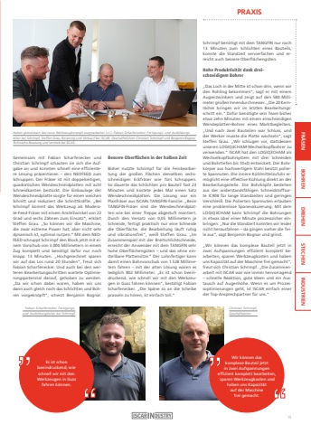 PRAXISFR%u00c4SEN BOHREN DREHEN STECHEN INDUSTRIENHaben gemeinsam das neue Werkzeugkonzept ausgearbeitet (v.l.): Fabian Scharfenecker, Fertigungs- und Ausbildungsleiter bei Schrimpf, Steffen Grau, Beratung und Verkauf bei ISCAR, Gesch%u00e4ftsf%u00fchrer Christian Schrimpf und Benjamin Bognar, Technische Beratung und Vertrieb bei ISCAR.Gemeinsam mit Fabian Scharfenecker und Christian Schrimpf schauten sie sich die Aufgabe an und konnten schnell eine effizientere L%u00f6sung pr%u00e4sentieren %u2013 den NEOFEED zum Schruppen. Der Fr%u00e4ser ist mit doppelseitigen, quadratischen Wendeschneidplatten mit acht Schneidkanten best%u00fcckt. Die Einbaulage der Wendeschneidplatte sorgte f%u00fcr einen weichen Schnitt und reduziert die Schnittkr%u00e4fte. %u201eBei Schrimpf kommt das Werkzeug als Moderate-Feed-Fr%u00e4ser mit einem Anstellwinkel von 22 Grad und sechs Z%u00e4hnen zum Einsatz%u201c, erkl%u00e4rt Steffen Grau. %u201eSo k%u00f6nnen wir die Maschine, die zwar extreme Power hat, aber nicht sehr dynamisch ist, optimal nutzen.%u201c Mit dem NEOFEED schruppt Schrimpf den Block jetzt mit einem Vorschub von 3.000 Millimetern in einem Zug komplett und ben%u00f6tigt daf%u00fcr nur noch knapp 13 Minuten. %u201eHochgerechnet sparen wir auf das Los rund 20 Stunden%u201c, freut sich Fabian Scharfenecker. Und auch bei den weiteren Bearbeitungsschritten wartete Optimierungspotenzial darauf, gehoben zu werden.%u201eDa wir schon dabei waren, haben wir uns dann auch gleich noch das Schlichten und Bohren vorgekn%u00f6pft%u201c, scherzt Benjamin Bognar.Bessere Oberfl%u00e4chen in der halben ZeitBisher nutzte Schrimpf f%u00fcr die Feinbearbeitung der gro%u00dfen Fl%u00e4chen denselben sechsschneidigen Eckfr%u00e4ser wie f%u00fcrs Schruppen.So dauerte das Schlichten pro Bauteil fast 23 Minuten und kostete jedes Mal einen Satz Wendeschneidplatten. Die L%u00f6sung war ein Planfr%u00e4ser aus ISCARs TANGFIN-Familie. %u201eBeim TANGFIN-Fr%u00e4ser sind die Wendeschneidplatten wie bei einer Treppe abgestuft montiert.Durch den Versatz von 0,05 Millimetern je Schneide, fertigt praktisch nur eine Schneide die Oberfl%u00e4che, die Bearbeitung l%u00e4uft ruhig und vibrationsfrei%u201c, wei%u00df Steffen Grau. %u201eIm Zusammenspiel mit der Breitschlichtschneide, erreicht der Anwender mit dem TANGFIN sehr hohe Oberfl%u00e4cheng%u00fcten %u2013 und das ohne einstellbare Plattensitze.%u201c Der Lohnfertiger kann damit einen Bahnvorschub von 1.528 Millimetern fahren %u2013 mit der alten L%u00f6sung waren es lediglich 802 Millimeter. %u201eEs ist schon beeindruckend, wie schnell wir mit den Werkzeugen in Guss fahren k%u00f6nnen%u201c, best%u00e4tigt Fabian Scharfenecker. %u201eDie Sp%u00e4ne so an die Scheibe prasseln zu h%u00f6ren, ist einfach toll.%u201c Es ist schon beeindruckend, wie schnell wir mit den Werkzeugen in Guss fahren k%u00f6nnen.Fabian Scharfenecker, Fertigungsund Ausbildungsleiter bei SchrimpfChristian Schrimpf, Gesch%u00e4ftsleiterSchrimpf ben%u00f6tigt mit dem TANGFIN nur noch 13 Minuten zum Schlichten eines Bauteils, konnte die Standzeit vervierfachen und erreicht auch bessere Oberfl%u00e4cheng%u00fcten.Hohe Produktivit%u00e4t dank dreischneidigem Bohrer%u201eDas Loch in der Mitte ist schon drin, wenn wir den Rohling bekommen%u201c, sagt er mit einem Augenzwinkern und zeigt auf den 580 Millimeter gro%u00dfen Innendurchmesser. %u201eDie 20 Kernl%u00f6cher bringen wir im letzten Bearbeitungsschritt ein.%u201c Daf%u00fcr ben%u00f6tigte sein Team bisher etwa zehn Minuten mit einem einschneidigen Wendeplatten-Bohrer eines Marktbegleiters.%u201eUnd nach zwei Bauteilen war Schluss, und der Werker musste die Platte wechseln%u201c, sagt Steffen Grau. %u201eWir schlugen vor, stattdessen unseren LOGIQ3CHAM-Wechselkopfbohrer zu verwenden.%u201c ISCAR hat den LOGIQ3CHAM als Wechselkopfbohrsystem mit drei Schneiden und Bohrtiefen bis 10%u00d7D entwickelt. Der Bohrk%u00f6rper aus hochwertigem Stahl besitzt polierte Spannuten. Die innere K%u00fchlmittelzufuhr erm%u00f6glicht eine effektive K%u00fchlung direkt an der Bearbeitungsstelle. Die Bohrk%u00f6pfe bestehen aus der widerstandsf%u00e4higen Schneidstoffsorte IC908 f%u00fcr lange Standzeiten und geringen Verschlei%u00df. Die Polierten Spannuten erlauben eine problemlose Spanevakuierung. Mit dem LOGIQ3CHAM kann Schrimpf die Bohrungen in etwas %u00fcber einer Minute prozesssicher einbringen. %u201eNur die Standzeit konnten wir leider nicht herausfahren %u2013 da gingen vorher die Teile aus%u201c, sagt Benjamin Bognar und grinst.%u201eWir k%u00f6nnen das komplexe Bauteil jetzt in zwei Aufspannungen effizient komplett bearbeiten, sparen Werkzeugkosten und haben uns Kapazit%u00e4t auf der Maschine frei gemacht%u201c, freut sich Christian Schrimpf. %u201eDie Zusammenarbeit mit ISCAR war wie immer hervorragend %u2013 schnelle Reaktion, gute Ideen und ein Austausch auf Augenh%u00f6he. Wenn es um Prozessoptimierungen geht, ist ISCAR einfach einer der Top-Ansprechpartner f%u00fcr uns.%u201cWir k%u00f6nnen das komplexe Bauteil jetzt in zwei Aufspannungen effizient komplett bearbeiten, sparen Werkzeugkosten und haben uns Kapazit%u00e4t auf der Maschine frei gemacht.15