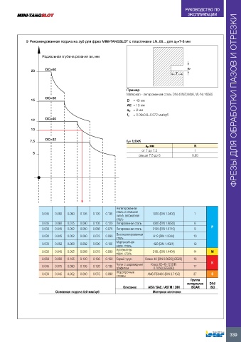 9  Рекомендованная подача на зуб для фрез MINI-TANGSLOT с пластинами LN..08... для ap=7-8 мм