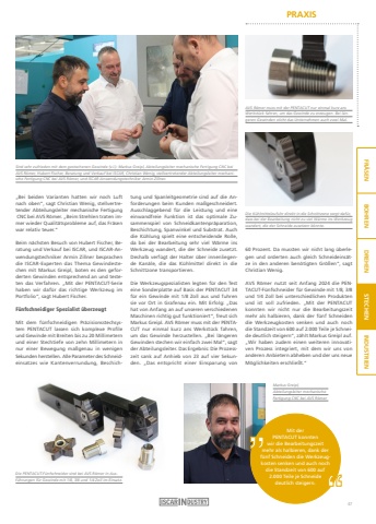 PRAXISFR%u00c4SEN BOHREN DREHEN STECHEN INDUSTRIENMarkus Greipl, Abteilungsleiter mechanische Fertigung CNC bei AVS R%u00f6merDie K%u00fchlmittelzufuhr direkt in die Schnittzone sorgt daf%u00fcr, dass bei der Bearbeitung nicht zu viel W%u00e4rme ins Werkzeug wandert, die der Schneide zusetzen k%u00f6nnte.Mit der PENTACUT konnten wir die Bearbeitungszeit mehr als halbieren, dank der f%u00fcnf Schneiden die Werkzeugkosten senken und auch noch die Standzeit von 600 auf 2.000 Teile je Schneide deutlich steigern.Die PENTACUT-F%u00fcnfschneider sind bei AVS R%u00f6mer in Ausf%u00fchrungen f%u00fcr Gewinde mit 1/8, 3/8 und 1/4 Zoll im Einsatz.%u201eBei beiden Varianten hatten wir noch Luft nach oben%u201c, sagt Christian Wenig, stellvertretender Abteilungsleiter mechanische Fertigung CNC bei AVS R%u00f6mer. %u201eBeim Strehlen traten immer wieder Qualit%u00e4tsprobleme auf, das Fr%u00e4sen war relativ teuer.%u201cBeim n%u00e4chsten Besuch von Hubert Fischer, Beratung und Verkauf bei ISCAR, und ISCAR-Anwendungstechniker Armin Zillner besprachen die ISCAR-Experten das Thema Gewindestechen mit Markus Greipl, boten es den geforderten Gewinden entsprechend an und testeten das Verfahren. %u201eMit der PENTACUT-Serie haben wir daf%u00fcr das richtige Werkzeug im Portfolio%u201c, sagt Hubert Fischer.F%u00fcnfschneidiger Spezialist %u00fcberzeugtMit dem f%u00fcnfschneidigen Pr%u00e4zisionsstechsystem PENTACUT lassen sich komplexe Profile und Gewinde mit Breiten bis zu 20 Millimetern und einer Stechtiefe von zehn Millimetern in nur einer Bewegung ma%u00dfgenau in wenigenSekunden herstellen. Alle Parameter des Schneideinsatzes wie Kantenverrundung, Beschichtung und Spanleitgeometrie sind auf die Anforderungen beim Kunden ma%u00dfgeschneidert.Ausschlaggebend f%u00fcr die Leistung und eine einwandfreie Funktion ist das optimale Zusammenspiel von Schneidkantenpr%u00e4paration, Beschichtung, Spanwinkel und Substrat. Auch die K%u00fchlung spielt eine entscheidende Rolle, da bei der Bearbeitung sehr viel W%u00e4rme ins Werkzeug wandert, die der Schneide zusetzt.Deshalb verf%u00fcgt der Halter %u00fcber innenliegende Kan%u00e4le, die das K%u00fchlmittel direkt in die Schnittzone transportieren.Die Werkzeugspezialisten legten f%u00fcr den Test eine Sonderplatte auf Basis der PENTACUT 34 f%u00fcr ein Gewinde mit 1/8 Zoll aus und fuhren sie vor Ort in Grafenau ein. Mit Erfolg: %u201eDas hat von Anfang an auf unseren verschiedenen Maschinen richtig gut funktioniert%u201c, freut sich Markus Greipl. AVS R%u00f6mer muss mit der PENTACUT nur einmal kurz ans Werkst%u00fcck fahren, um das Gewinde herzustellen. %u201eBei l%u00e4ngeren Gewinden stechen wir einfach zwei Mal%u201c, sagt der Abteilungsleiter. Das Ergebnis: Die Prozesszeit sank auf Anhieb von 23 auf vier Sekunden. %u201eDas entspricht einer Einsparung von 60 Prozent. Da mussten wir nicht lang %u00fcberlegen und orderten auch gleich Schneideins%u00e4tze in den anderen ben%u00f6tigten Gr%u00f6%u00dfen%u201c, sagt Christian Wenig.AVS R%u00f6mer nutzt seit Anfang 2024 die PENTACUT-F%u00fcnfschneider f%u00fcr Gewinde mit 1/8, 3/8 und 1/4 Zoll bei unterschiedlichen Produkten und ist voll zufrieden. %u201eMit der PENTACUT konnten wir nicht nur die Bearbeitungszeit mehr als halbieren, dank der f%u00fcnf Schneiden die Werkzeugkosten senken und auch noch die Standzeit von 600 auf 2.000 Teile je Schneide deutlich steigern%u201c, z%u00e4hlt Markus Greipl auf.%u201eWir haben zudem einen weiteren innovativen Prozess integriert, mit dem wir uns von anderen Anbietern abheben und der uns neue M%u00f6glichkeiten erschlie%u00dft.%u201c AVS R%u00f6mer muss mit der PENTACUT nur einmal kurz ans Werkst%u00fcck fahren, um das Gewinde zu erzeugen. Bei l%u00e4ngeren Gewinden sticht das Unternehmen auch zwei Mal.Sind sehr zufrieden mit dem gestochenen Gewinde (v.l.): Markus Greipl, Abteilungsleiter mechanische Fertigung CNC bei AVS R%u00f6mer, Hubert Fischer, Beratung und Verkauf bei ISCAR, Christian Wenig, stellvertretender Abteilungsleiter mechanische Fertigung CNC bei AVS R%u00f6mer, und ISCAR-Anwendungstechniker Armin Zillner.47