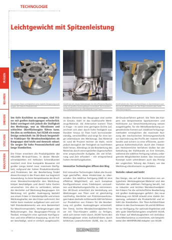 TECHNOLOGIEFR%u00c4SEN BOHREN DREHEN STECHEN INDUSTRIENLeichtgewicht mit SpitzenleistungUm tiefe Kavit%u00e4ten zu erzeugen, sind Fr%u00e4ser mit gro%u00dfen Auskragungen erforderlich. Dabei verringert sich jedoch die Steifigkeit des Werkzeugs, was zu Vibrationen und schlechter Oberfl%u00e4cheng%u00fcte f%u00fchren kann. Um dies zu verhindern, hat ISCAR ein neues Design entwickelt: Im 3D-Druck hergestellte Fr%u00e4sk%u00f6rper f%u00fcr Wendeschneidplatten als Baugruppe sind leicht und dennoch robust. Sie sorgen f%u00fcr hohe Prozesssicherheit und lange Standzeiten.Die Fr%u00e4ser erweitern die Produktpalette der HELI2000 90-Grad-Fr%u00e4ser, in denen Wendeschneidplatten mit helikalen Schneidkanten montiert sind. Eine kompakte Bauweise mit gro%u00dfer L%u00e4nge bietet zwar maximale Steifigkeit, aufgrund der hohen Produktionskosten und Problemen bei der Bearbeitung findet dieses Konzept in der Praxis aber nur begrenzt Anwendung. So kann beispielsweise der Bruch einer Wendeschneidplatte den Werkzeugk%u00f6rper besch%u00e4digen und damit hohe Kosten verursachen. Um dies zu verhindern, setzen die Hersteller auf Werkzeug-Baugruppen. Ein Werkzeug mit gro%u00dfer Auskragung besteht aus einem Fr%u00e4ser in Standardgr%u00f6%u00dfe und einem Werkzeughalter, der den Fr%u00e4ser aufnimmt. Der Halter kann modular aufgebaut sein und enth%u00e4lt Standardelemente wie eine Basiseinheit f%u00fcr Maschinenspindeln, Verl%u00e4ngerungen oder Reduzierungen. Das Baugruppen-Prinzip ist flexibel, erm%u00f6glicht eine optimale Konfiguration und eine effektive Anpassung. Ist ein Fr%u00e4ser besch%u00e4digt, wird er einfach ausgetauscht.Andere Elemente der Baugruppe sind weiter im Einsatz. Stahl ist das traditionelle Werkzeug-Material. Als Alternative kommt Titan in Frage %u2013 es weist eine geringere Dichte auf, zeichnet sich aber durch hohe Festigkeit aus.Dar%u00fcber hinaus ist Titan hoch korrosionsbest%u00e4ndig, verschlei%u00dffest und sorgt f%u00fcr eine lange Lebensdauer des Werkzeugs. Das Material ist rund 40 Prozent leichter als Stahl, reicht jedoch bez%u00fcglich der Festigkeit an hochfesten Stahl heran. Allerdings ist die Bearbeitung des Materials durch seine speziellen Eigenschaften eine anspruchsvolle Aufgabe, die viel Erfahrung und Zeit erfordert %u2013 mit entsprechend hohen Herstellungskosten.Innovative Technologien %u00f6ffnen den WegErst innovative Technologien haben die Grundlage geschaffen, diese Hindernisse zu %u00fcberwinden. Die Additive Fertigung (AM) ist eine effektive M%u00f6glichkeit, um auch komplexe Konfigurationen eines Fr%u00e4sk%u00f6rpers umzusetzen und Bearbeitungsschritte zu minimieren.Der 3D-Druck erleichtert die Herstellung von Werkzeugen aus Titan und ist gleichzeitig nachhaltig. Hersteller von Pr%u00e4zisionswerkzeugen haben deshalb mittlerweile AM-Verfahren zur Produktion von Fr%u00e4sern f%u00fcr die Bearbeitung mit gro%u00dfen Auskragl%u00e4ngen entwickelt.Der Trend, leichte Wendeschneidplatten-Fr%u00e4ser mit Titan-K%u00f6rpern additiv zu fertigen, setzt sich immer mehr durch. ISCAR formt den Werkzeugk%u00f6rper eines Aufsteckfr%u00e4sers durch Selektives Laserschmelzen (SLM), das zu den 3D-Druckverfahren geh%u00f6rt. Die Teile des K%u00f6rpers wie beispielsweise Spankammern und Hohlr%u00e4ume zur Gewichtsreduzierung weisen ausgekl%u00fcgelte, f%u00fcr die Metallbearbeitung ungew%u00f6hnliche Formen auf. Additive Fertigungsmethoden erm%u00f6glichen die maximale Nutzung der mechanischen Str%u00f6mungsmechanik zur Optimierung des Profils der inneren K%u00fchlkan%u00e4le und sichern so eine effiziente, punktgenaue K%u00fchlmittelzufuhr durch den Fr%u00e4sk%u00f6rper. Herk%u00f6mmliche Verfahren sto%u00dfen bei der Gestaltung der K%u00fchlkan%u00e4le an ihre Grenzen, w%u00e4hrend die additive Fertigung nahezu unbegrenzte M%u00f6glichkeiten bietet. Das innovative Konzept nutzt unterdessen auch das Prinzip der ungleichen Teilung des Fr%u00e4sers, um das Werkzeug vibrationsarm zu gestalten.Vorteile: robust und leichtDas Design, das auf der Kombination von untypischem Werkzeugk%u00f6rper-Material und den Vorteilen der additiven Fertigung beruht, hat zu robusten und leichten Wendeschneidplatten-Fr%u00e4sern f%u00fcr die wirtschaftliche Bearbeitung mit gro%u00dfen Auskragungen gef%u00fchrt. Das neue Werkzeug von ISCAR erlaubt eine stabile Zerspanung, verbessert die Produktivit%u00e4t und erh%u00f6ht die Standzeiten. Die Titan-Aufsteckfr%u00e4ser stehen in den Durchmessern 50 und 63 Millimeter zur Verf%u00fcgung. F%u00fcr optimale Ergebnisse und sehr gute Oberfl%u00e4cheng%u00fcten empfiehlt ISCAR, die Fr%u00e4ser auf Werkzeughaltern mit Antivibrations-Mechanismus zu montieren, wie beispielsweise den WHISPERLINE-Adapter von ISCAR.Die neuen Fr%u00e4ser erm%u00f6glichen eine stabile Zerspanung undsorgen f%u00fcr h%u00f6here Produktivit%u00e4t.ISCAR bietet die Titan-Aufsteckfr%u00e4ser in Durchmessern von50 und 63 Millimetern an. Die Fr%u00e4ser erzielen sehr hoheOberfl%u00e4cheng%u00fcten.ISCAR hat ein neues Fr%u00e4serdesign f%u00fcr die effiziente Bearbeitung mit gro%u00dfen Auskragl%u00e4ngen entwickelt. Sie erweitern die Produktpalette der HELI2000 90-Grad-Fr%u00e4ser.16