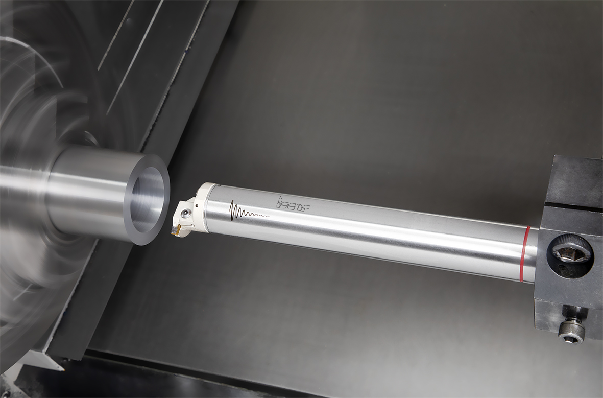 3.1.在内孔车削加工中,镗杆是影响刀具刚性的主要因素。大的长径比将导致刀具挠曲及振动;是影响加工精度及表面质量的本源。防振降噪WHISPERLINE系列的研制正是为了打破长径比的边界。这些镗杆内置有特别设计的内部减振装置及减振机构,使得在长径比14倍径范围内的切削更稳定。(图2)